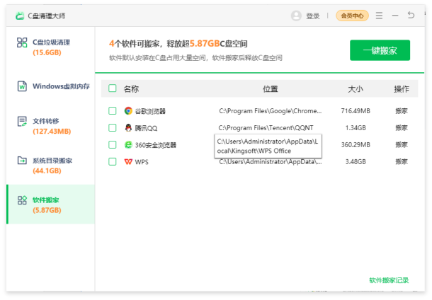 软件搬家一目了然,还可一键释放Windows虚拟内存、将C盘文件转移到其它磁盘以及系统目录搬家